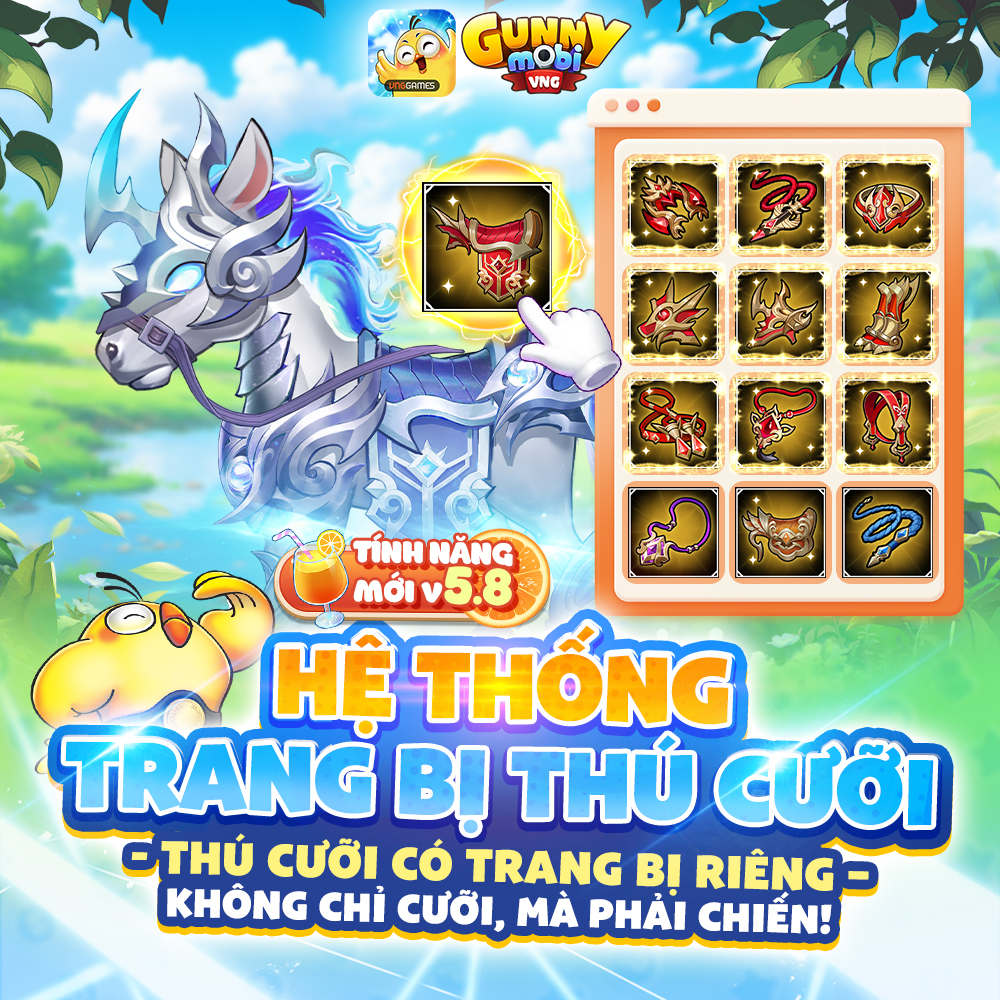 - Trong chức năng Thú Cưỡi, thêm mục “Trang Bị Thú Cưỡi”, bao gồm 10 bộ phận (Yên Ngựa, Bàn Đạp, Giáp Đầu, Giáp Trước, Giáp Đuôi, Giáp Chân, Móng Sắt, Roi Ngựa, Dây Cương, Mặt Dây Treo).